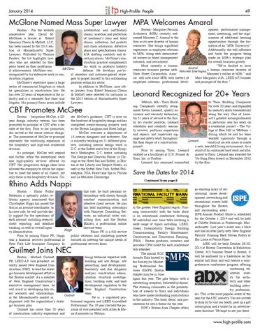 Boston - Margulies Perruzzi opment, performance manageArchitects (MPA) recently welment, mentoring, and the orgacomed Maureen C. Amaral to the nization of additional learning firm as its new director of human opportunities through the forresources. She brings significant mation of an “MPA University.” experience in employee relations Additionally, she will influence to MPA, along with demonstratand track the progress being ed success in talent management, made on MPA’s strategic plan outreach, and recruitment. for overall business growth. Most recently a human “We’re thrilled to have Amaral resources business partner with Photo credit: Bruce Rogovin a human resources director of State Street Corporation, AmaMaureen’s caliber at MPA,” said ral will now assist MPA with matters of Marc Margulies, AIA, LEED AP, founder employee relations, professional develand principal of the firm.”