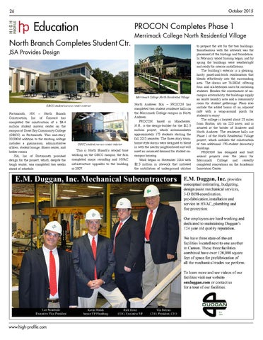 to prepare the site for the two buildings. Simultaneous with the sitework was the placement of the footings and foundation. In February, wood framing began, and by spring the buildings were weathertight and ready for interior installations. The building’s exterior is a pleasing, hardy, panel-and-brick combination that blends effortlessly into the surrounding area. The dorms are 76,000sf, offering four- and six-bedroom units for incoming students. Besides the convenience of oncampus accessibility, the buildings supply an onsite laundry area and a community room for student gatherings. Plans also include the added bonus of an adjacent café with a wrap-around porch for students to enjoy. The college is located about 25 miles from Boston, sits on 220 acres, and is situated at the border of Andover and North Andover. The residence halls are Phase 1 of the North Residential Village project, which includes the construction of two additional 170-student dormitory buildings. PROCON has designed and built several projects over the years for Merrimack College and recently completed renovations on the Academic Innovation Center.