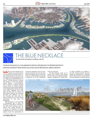 THE BLUE NECKLACE IS A COLLABORATIVE DESIGN EXPLORATION TO PRESERVE BOSTON’S EXISTING SEAFRONT FROM RISING SEA LEVELS WHILE PROMOTING URBAN GROWTH We now know that Boston will experience an existential threat from sea level rise within the century, or more catastrophically, in the nearer term. The question for future generations will be, “What did the 2020 Bostonians do about it?” The Blue Necklace is a project that attempts to answer that question, pulling together a multi-disciplinary team to develop a response. Boston’s current strategy of creating flood-able infrastructure, locally resilient buildings, and strengthening the existing water edge meets today’s challenges from storm surge and king tides. In contrast, the Blue Necklace addresses the anticipated permanent and significant sea level rise, extending new land within the harbor to protect the city, while creating opportunities for open space and development. With this project, we are researching a comprehensive plan to ensure the protection of East Boston, Charlestown, the North End, Downtown and the Seaport. The guiding principles are to prevent the inundation of existing neighborhoods, retain current waterfront property, create new opportunities for