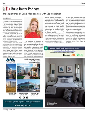Build Better Podcast The Importance of Crisis Management with Lisa Nickerson By Emily Langner On episode 10 of the Build Better podcast, Anastasia welcomed Lisa Nickerson, CEO and founder of Nickerson People Relations and Nickerson Real Estate Partners, to talk about the importance of having a good crisis management plan in place, and what companies and individuals can do to better manage a crisis. According to Nickerson, one of the biggest misconceptions is what really defines a crisis. She says 96% of what she and the professionals at her firm manage are not catastrophes, but things that can still affect a company’s brand. Non-catastrophe crises can include things like an employee being terminated or leaving, an employee being arrested, a member of the firm having a public altercation with a spouse or ex-spouse, a family member of an executive getting into trouble and making the news, or a company’s product failing – all things that can damage the reputation of the company, Nickerson says.