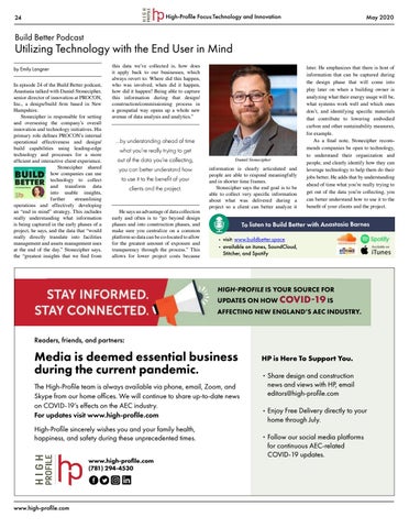 Utilizing Technology with the End User in Mind by Emily Langner In episode 24 of the Build Better podcast, Anastasia talked with Daniel Stonecipher, senior director of innovation at PROCON, Inc., a design/build firm based in New Hampshire. Stonecipher is responsible for setting and overseeing the company’s overall innovation and technology initiatives. His primary role defines PROCON’s internal operational effectiveness and design/ build capabilities using leading-edge technology and processes for a more efficient and interactive client experience. Stonecipher shared how companies can use technology to collect and transform data into usable insights, further streamlining operations and effectively developing an “end in mind” strategy. This includes really understanding what information is being captured in the early phases of a project, he says, and the data that “would really directly translate into facilities management and assets management uses at the end of the day.” Stonecipher says, the “greatest insights that we find from