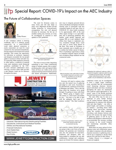 Special Report: COVID-19’s Impact on the AEC Industry The Future of Collaboration Spaces The need for divisions comes in many forms and will take shape in many ways. High-back dividers provide further protection in close-proximity arrangements. Not only will physical divisions be necessary, but the use of modular seating may increase, as it may be reconfigured as required to meet updates to CDC guidelines.