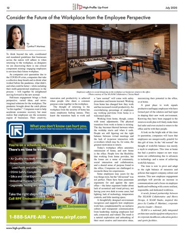 by Cynthia P. Martinez To think beyond the safe, coordinated and mandated guidelines that businesses across the nation will adhere to when returning to the workplace, as designers we are discovering there is one critical component missing: engaging employees to envision their future workplace. As companies exit quarantine due to the COVID-19 crisis, companies that take a collective deep breath and re-think what worked before the pandemic, what didn’t, and what could be better – while including their multi-generational employees in the process – will together be enlightened moving forward in the new normal. Full-team engagement brings a fresh perspective, varied ideas, and neverimagined solutions for the workplace. The pandemic brought about the catch phrase “in this together.” Companies want to help accelerate economic recovery but must realize that employees are the economic engine of businesses. Their creativity,