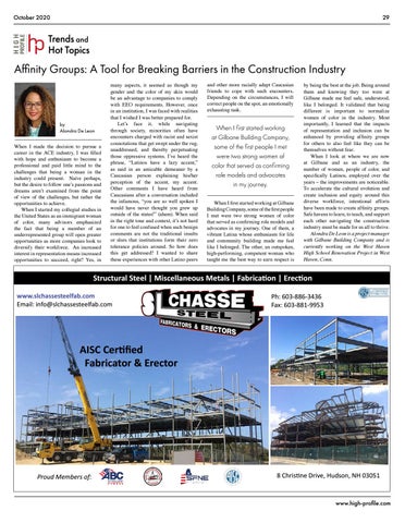 by being the best at the job. Being around them and knowing they too were at Gilbane made me feel safe, understood, like I belonged. It validated that being different is important to normalize women of color in the industry. Most importantly, I learned that the impacts of representation and inclusion can be enhanced by providing affinity groups for others to also feel like they can be themselves without fear. When I look at where we are now at Gilbane and as an industry, the number of women, people of color, and specifically Latinos, employed over the years – the improvements are noticeable. To accelerate the cultural evolution and create inclusion and equity around this diverse workforce, intentional efforts have been made to create affinity groups. Safe havens to learn, to teach, and support each other navigating the construction industry must be made for us all to thrive. Alondra De Leon is a project manager with Gilbane Building Company and is currently working on the West Haven High School Renovation Project in West Haven, Conn.