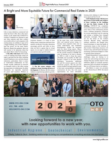 housing units, helping to make housing more equal and fair for all. 3. Development teams will increase their focus on the health and wellness of those working on the building, not just the future tenants of the building. COVID-19 has completely forced development teams to reconsider every facet of the construction process from a wellness perspective. Protocols for on-site sanitization and for entering and exiting a building have changed drastically overnight. These changes are for the better of the workers involved. Beyond being important wellness initiatives, the changes have forced developers to keep the health of construction teams at the forefront of their minds. I think these measures will be here to stay, and will lead to developers increasing construction budgets in order to maintain these initiatives. Despite the pandemic’s unprecedented challenges, many are leaning in to create new and exciting innovations and changes that may actually improve some industries. While it’s certainly anyone’s guess how 2021 will unfold, I am hopeful that we will bounce back as an industry. John Hurley is senior vice president of the Boston-based HYM Investment Group.