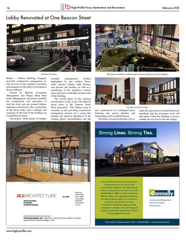 included contemporary finishes highlighted by new modern floors, walls, elevator lobbies, light fixtures, and elevator cab finishes, as well as a resurfacing of the property’s exterior steps and stone on the Beacon Street side of the building. The second phase of this ongoing revitalization of the iconic One Beacon Street tower is the Tremont Street Plaza renovation. The Gilbane team is currently on site providing construction management services for a scope that includes the selective demolition of the existing plaza’s layout/finishes and the