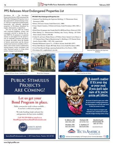 PPS Releases Most Endangered Properties List Providence, RI – The Providence Preservation Society (PPS) announced the 2021 Most Endangered Properties List at the organization’s annual meeting on Jan. 27. The list is comprised of architecturally, historically, and culturally significant properties in Providence threatened by neglect, deterioration, or demolition. For over 25 years, PPS has worked with concerned neighbors, owners, and community activists to develop the annual MEP list. Its purpose is to generate interest in and support for the preservation of vulnerable structures and places; to educate the public about the benefits of historic preservation and the diverse architectural resources available in Providence; and to foster creative collaboration among property owners, developers, and other interested parties to bring about positive change at each property.