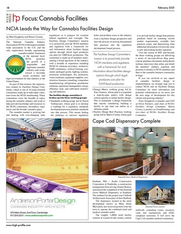 Focus: Cannabis Facilities NCIA Leads the Way for Cannabis Facilities Design by Peter Dougherty and Shawn Cooney The National Cannabis Industry Association (NCIA) is the largest cannabis trade association in the U.S. and the only organization broadly representing cannabis-related businesses at the national level. NCIA promotes the growth of a responsible and legitimate cannabis industry and works toward a favorable social, economic, and legal environment for that industry in the United States. As part of that mission, the organization created its Facilities Design Committee, which is one of 14 issue-oriented committees made up of individual volunteers from the NCIA membership. These committees cover the breadth of topics facing the cannabis industry and work to help provide knowledge and resources to the NCIA community, lawmakers, regulators, and the broader cannabis space. The cannabis market is growing fast and dealing with ever-changing state