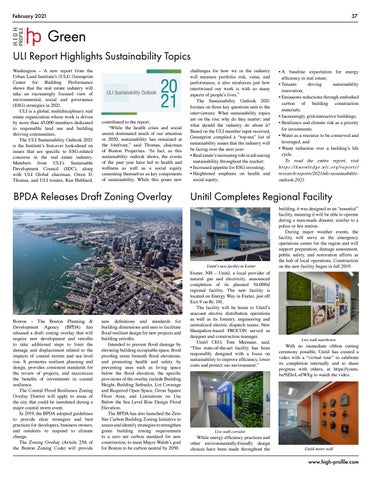 • A baseline expectation for energy efficiency in real estate; • Tenants driving sustainability innovation; • Emissions reductions through embodied carbon of building construction materials; • Increasingly grid-interactive buildings; • Resilience and climate risk as a priority for investments; • Water as a resource to be conserved and leveraged; and • Waste reduction over a building’s life cycle. To read the entire report, visit h t t ps://k n owledge. u li. org/rep o r ts / research-reports/2021/uli-sustainabilityoutlook-2021.