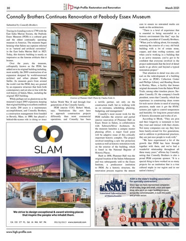 care to ensure no unwanted marks are made on the architecture. “There is a level of experience that is essential to being successful in a historic environment like that,” says Jay Connolly, president of Connolly Brothers. “When you’re talking about, for example, restoring the exterior of a very old brick building with a lot of ornate stone, copper, and slate roofing systems, and when you’re working in a building that is an active museum, you’ve got to be confident that everyone involved in the project understands that the level of detail needs to go above and beyond a typical restoration project.” That attention to detail was also critical on the redevelopment of a building to serve as PEM’s Collection Center and Phillips Library and Reading Room in Rowley, Mass., a facility that houses original documents from the Salem Witch Trials, among other timeless pieces. Stephen Connolly IV, the company’s fourth president, notes that Connolly, which has experience in constructing clean rooms for tech sector clients in need of exacting precision, made sure it got the HVAC systems just right to control temperature and humidity for long-term preservation of historic documents and works of art. According to Monk, “They are pros and their longevity is testament to how they treat and interact with their clients. Not many companies can say they have been family-owned for five generations, and in addition to professional practices, they are just nice people to work with.” “We have experienced a lot of the growth that PEM has been through together with them, and we’ve had a wonderful relationship throughout all these many years,” affirms Jay Connolly, noting that Connolly Brothers is also a proud PEM corporate sponsor. “It is a special thing to have worked on so many projects for an institution that is a true cultural staple in our region and in our nation’s history.”
