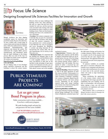 the right square footage and location, but a unique geometry. Before ruling it out, we created a test fit of the program and carved the labs into space aligned with structural bays. This approach allowed for an efficient layout and correct proportions for casework. To optimize workflow, we carefully plan space to maximize efficiencies. We examine every component and determine its value to the overall process. It is critical to invest time in the casework layouts, which will result in high functioning, ergonomic labs. When considering the opportunity of a life sciences tenant, consult with an experienced lab design specialist. By establishing that your building will be able to accommodate a lab environment before signing a lease, you will avoid construction cost nightmares and ensure your project’s success. Mark Pelletier, AIA is a principal at Maugel Architects where he manages the firm’s life sciences practice.