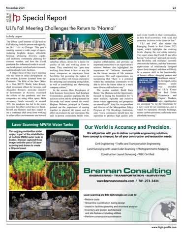 Special Report ULI’s Fall Meeting Challenges the Return to ‘Normal’ by Emily Langner The Urban Land Institute (ULI) held its Fall Meeting, both in-person and digitally, on Oct. 11-14 in Chicago. This year’s meeting covered a wide range of topics, including biophilic design; affordable housing; advancing diversity, equity, and inclusion; community planning for extreme weather; and how the Covid pandemic has influenced trends in mixeduse development, retail and entertainment, and travel and events facilities. A major focus of this year’s meeting was the future of office development. In the session, Lessons Learned from the Pandemic: The Role of the New Office in a Post-COVID World, John Rivard, chief investment officer for Accesso, and Alejandro Romero, associate director of Investments at Accesso, examined the effects of the pandemic and how companies are using office space. With occupancy levels currently at around 36%, the pandemic has led to the worst recession the office sector has ever faced. Rivard and Romero said they expect to see a continued shift away from working in urban office environments and toward