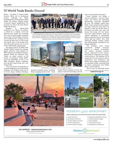 meet a strong demand for lab space.” Onsite amenities will include a 150-seat auditorium, a sky-level fitness center, and cultural and entertaining programming activations throughout the year. The building’s chilled beam HVAC system, tall floor-to-floor heights, and large column-free floor plates are designed to meet the flexible needs of life science and office users alike. The curtain wall system will also feature View Inc.’s Smart Windows, which use artificial intelligence to automatically adjust in response to the sun, maximizing natural light and outdoor views while optimizing building occupant comfort and reducing energy consumption from lighting and HVAC. The building’s smart design incorporates multiple innovative features to enhance sustainability and wellness including touchless systems, augmented air flow systems, post-pandemic safeguards and energysaving measures. The building will be among the first in the region to achieve certifications from SmartScore and SITES, and according to John Hynes IV, vice president at BGI, is pursuing Gold (or better) certifications from LEED, WELL, and WiredScore. The two acres of sustainable indoor/ continued to page 14