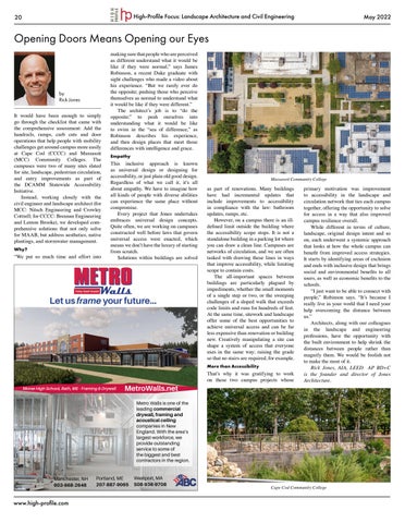 as part of renovations. Many buildings have had incremental updates that include improvements to accessibility in compliance with the law: bathroom updates, ramps, etc. However, on a campus there is an illdefined limit outside the building where the accessibility scope stops. It is not a standalone building in a parking lot where you can draw a clean line. Campuses are networks of circulation, and we are often tasked with drawing these lines in ways that improve accessibility, while limiting scope to contain costs. The all-important spaces between buildings are particularly plagued by impediments, whether the small moments of a single step or two, or the sweeping challenges of a sloped walk that exceeds code limits and runs for hundreds of feet. At the same time, sitework and landscape offer some of the best opportunities to achieve universal access and can be far less expensive than renovation or building new. Creatively manipulating a site can shape a system of access that everyone uses in the same way; raising the grade so that no stairs are required, for example. More than Accessibility