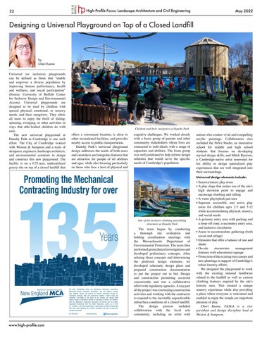 • Sensory/nature play areas • A play slope that makes use of the site’s high elevation point to engage and encourage climbing and rolling • A water play/splash pad area • Separate, accessible, and active play areas for children ages 2-5 and 5-12 while accommodating physical, sensory, and social needs • A primary entry area with parking and a drop-off zone, a secondary entry area, and inclusive circulation • Areas to accommodate gathering (both social and refuge) • Elements that offer a balance of sun and shade • On-site stormwater management features with educational signage • Protection of the existing tree canopy and new plantings in support of Cambridge’s urban forestry efforts We designed the playground to work with the existing unusual landforms related to the landfill as well as custom climbing features inspired by the site’s historic uses. This created a unique sensory experience while also providing a place where everyone is welcomed and enabled to enjoy the simple yet important pleasure of play. Cheri Ruane, FASLA is a vice president and design discipline lead at Weston & Sampson.