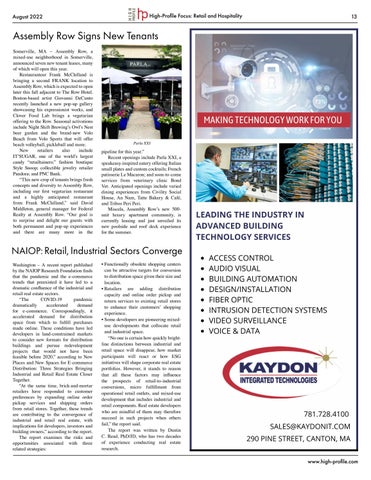 NAIOP: Retail, Industrial Sectors Converge Washington – A recent report published by the NAIOP Research Foundation finds that the pandemic and the e-commerce trends that preexisted it have led to a dramatic confluence of the industrial and retail real estate sectors. “The COVID-19 pandemic dramatically accelerated demand for e-commerce. Correspondingly, it accelerated demand for distribution space from which to fulfill purchases made online. These conditions have led developers in land-constrained markets to consider new formats for distribution buildings and pursue redevelopment projects that would not have been feasible before 2020,” according to New Places and New Spaces for E-commerce Distribution: Three Strategies Bringing Industrial and Retail Real Estate Closer Together. “At the same time, brick-and-mortar retailers have responded to customer preferences by expanding online order pickup services and shipping orders from retail stores. Together, these trends are contributing to the convergence of industrial and retail real estate, with implications for developers, investors and building owners,” according to the report. The report examines the risks and opportunities associated with three related strategies: