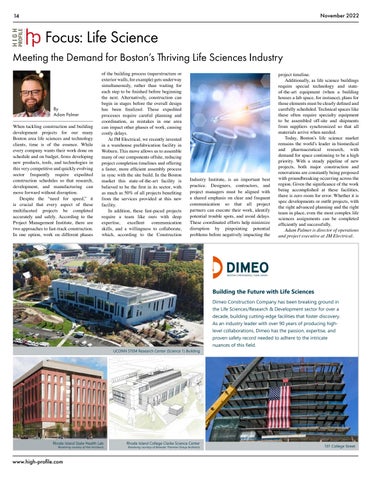 Time and technology are the topics that arise more than a few times in this Life Science issue, specifically in our expert industry articles. Construction takes time, but the new technology that life science companies are creating and using often can’t wait for a space to be completed. In his article on page 14, Adam Palmer