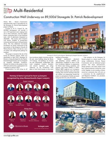On page 28, we highlight the Stonegate St. Patrick Redevelopment project in Natick, Mass. Nauset Construction is well underway on construction of the 4-story, 89,500sf structure, which will include 46 apartments and 14,000sf of restaurant and retail space. Read more about this exciting project that vice president of Nauset Construction, Benjamin Goldfarb, says is set to become the “cornerstone for the neighborhood.” Construction is anticipated to be completed in spring of 2025.