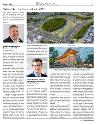 On page 13, Bryan Northrop and Paul Pedini of Skanska address the challenges relating to the cost of labor and materials, how construction firms will approach project selection in the upcoming year, and the industry’s continued push to standardize practices that prioritize sustainable design and decarbonization. Pedini says with the wave of price increases taking place in the industry, it is important to have a strategic and intentional approach to selecting projects to best navigate current market dynamics effectively.