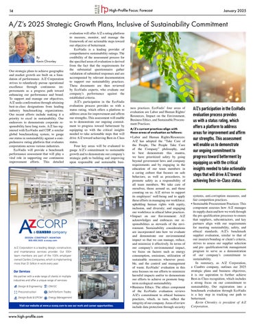 Corporation shares how the firm is focusing on sustainability by registering with EcoVadis, which will provide a benchmark performance assessment to support the company’s continuous improvement efforts. EcoVadis’ four areas of evaluation are Labor and Human Rights/ Resources, Impact on the Environment, Business Ethics, and Sustainable Procurement Practices. Read more on page 14.