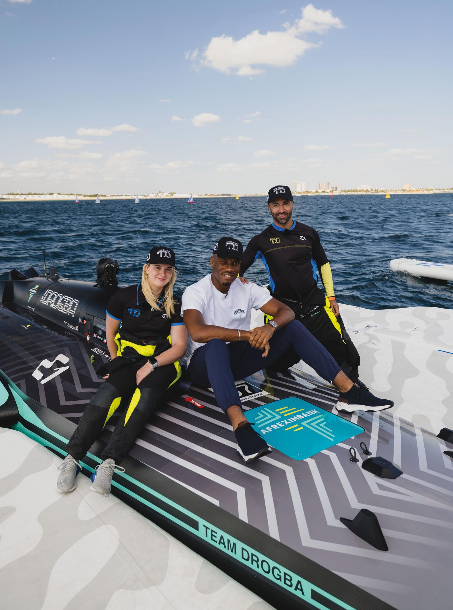 Right: Oban, pictured in Jeddah, Saudi Arabia, alongside former footballer and powerboating team owner, Didier Drogba, and teammate, Yousef Al-Abdulrazzaq.