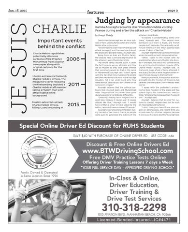 Judging by appearance Kamila Aouragh recounts discrimination while visiting France during and after the attack on “Charlie Hebdo” by Joseph Blakely Senior Kamila Aouragh was an hour outside of Paris visiting family when the Charlie Hebdo attacks occurred. “We were going to drive down the day the attack happened, and then we heard about the attack and decided not to,” Aouragh said. Being from an Arab and Muslim family, the attacks held a personal significance as the attackers were Muslim terrorists. “My entire family argued about it after the fact, because we are all Arabic and they are all Muslim so they took great offense that somebody would do that in the name of Muhammad,” Aouragh said. “I don’t agree with the fact that they murdered 12 people and then murdered four more in the hostage situation, but I can understand why they were doing it because you don’t make fun of someone’s religion.” Aouragh believes that the political cartoons that mocked Islam and Muhammad were “inappropriate” but would have gone about expressing her distaste differently. “Generally, making fun of religion is not a good idea, because it causes war. It causes attacks like that,” Aouragh said. “I would have written a letter or have talked to the editor, I wouldn’t have murdered 12 people.” Aouragh experienced discrimination during the rest of her time in France, as people were quick to generalize the actions of the