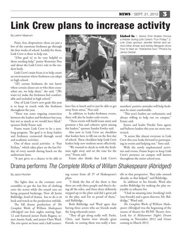 have fun at lunch and to just be able to get away from stress,” Noa said. In addition to leader-freshmen events, there will also be leader-only events. “These events will build team unity and promote a fun and cohesive spirit among the leaders,” sponsor Sandra Fowles said. Also new to Link Crew are checklists that leaders have to fill out on the first day of school. These checklists help Link Crew leaders help new students more effectively. “We wanted to check in with the freshmen right away and set the tone for the year,” Frame said. Frame also thinks that Link Crew’s