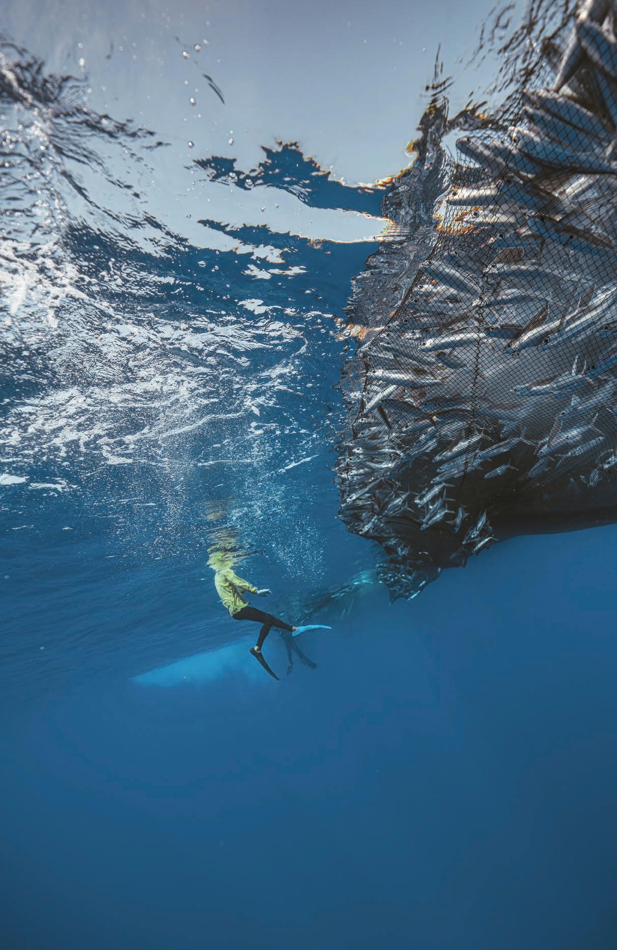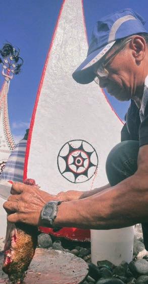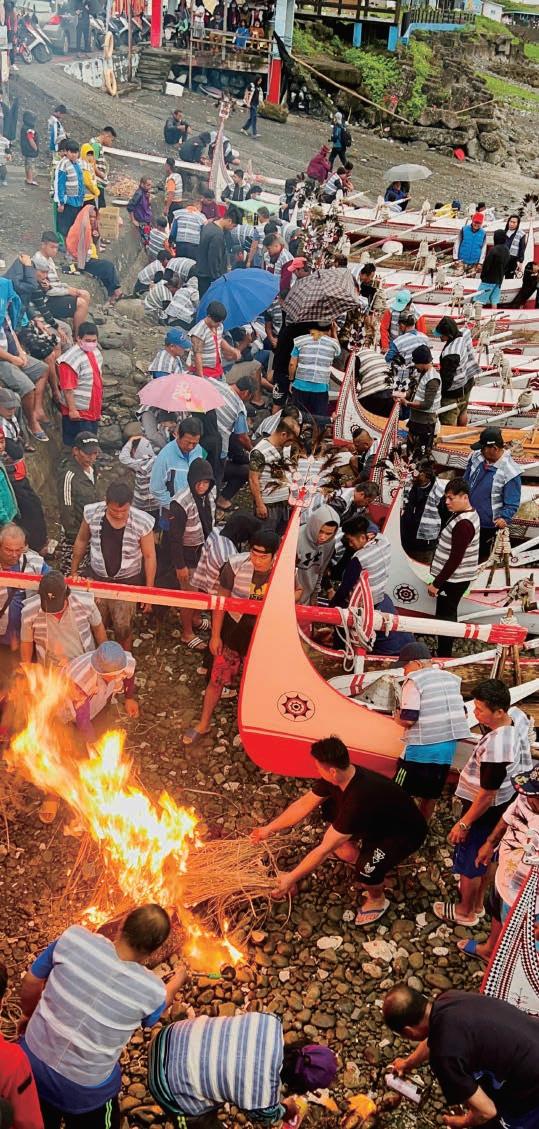 自南島民族的航海大遷徙開始,島上的達悟族民仍未遺忘與 大海永恆的誓約,海洋鹹腥的氣味已烙印於達悟人的每片肌 膚。蘭嶼的小孩從第一步踏出腳跟時,就被父親抱著參加每 年的招魚祭典,父親懷抱著幼兒,以右手舀起混合海水的雞 血,唸著祈禱語詞塗抹在祖先航道的鵝卵石上,孩子的身體