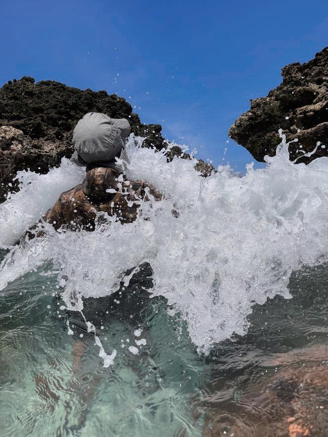 與鼻腔便沾濡了海的溫度,這是達悟族孩子與海洋首次的誓 約,同時也是全部落族人認可其為海洋之子的神聖儀式,往 後的日子,他要學會被海洋擁抱的感覺,感知海洋的溫度, 聆聽大海的聲音,判別海洋母親的暴怒跟溫柔,辨別海浪碎 裂擊打礁岩的湍急迴漩渦流。