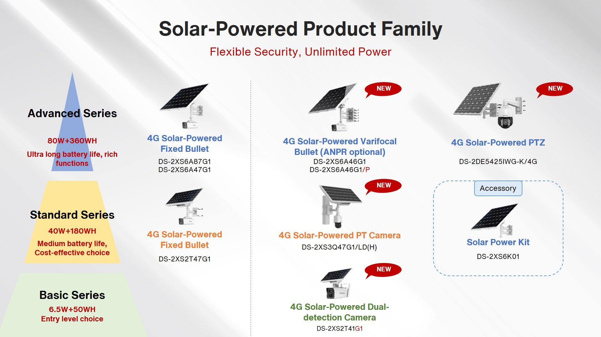 Powered by sunlight, Hikvision’s Solar-powered Security Camera Setups help establish critical awareness in locations where power cords are difficult to deploy. Hikvision’s solarpowered product family continues to grow, adding multiple functions and formats – even kits you can design yourself for your unique application. The new-generation solar-powered products provide flexible viewing angles, simple deployment, and reliable performance for virtually limitless scenarios.