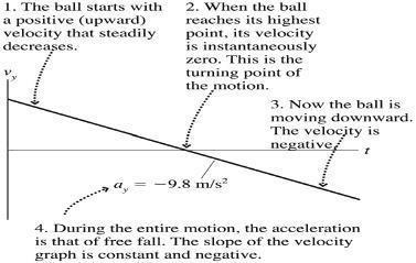 Assess: Make sure that the graph touches or crosses the t axis whenever the velocity is zero In this case, that is only when it reaches the top of its trajectoryand the velocity vector is changing direction from up to down It is also worth noting that this graph would be more complicated if we were to include the time at the beginning when the rock is being accelerated by the hand. Think about what that would entail.
