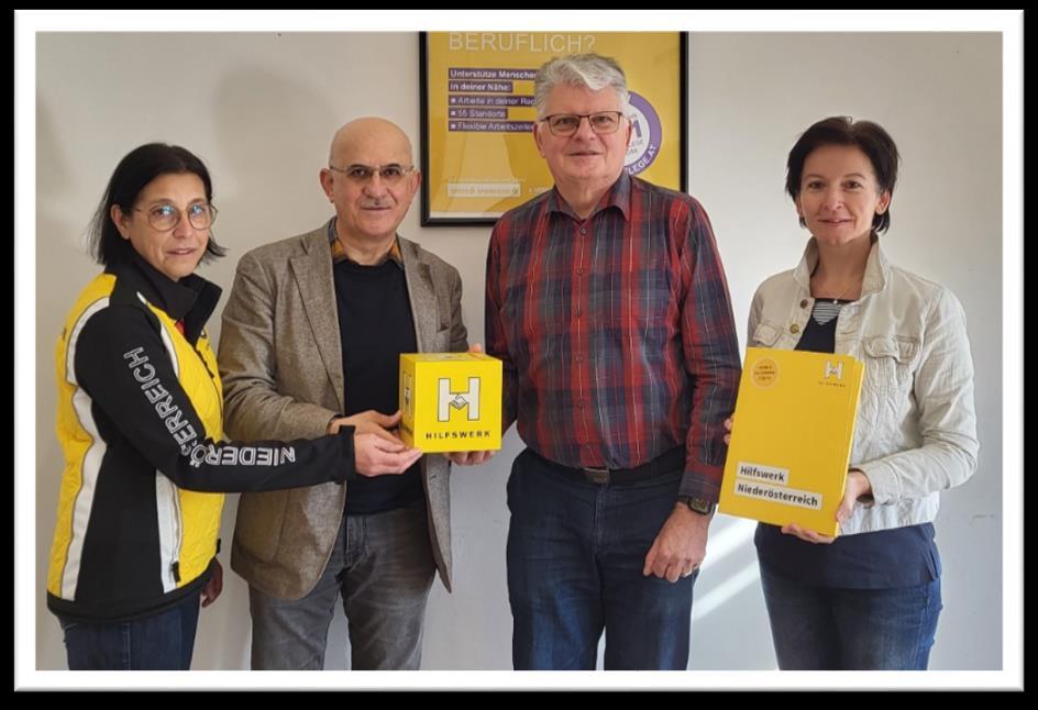 FreuensichüberdieKooperationfürdasEhrenamt:MichaelaPasching(Hilfswerk,ServicestelleEhrenamt),HilfswerkPflegedirektorinGabrielaGoll,BernhardLackner(VorstandsdirektorNiederösterreichischeVersicherung)undMariaWallner (VorsitzendeHilfswerkAtzenbrugg).