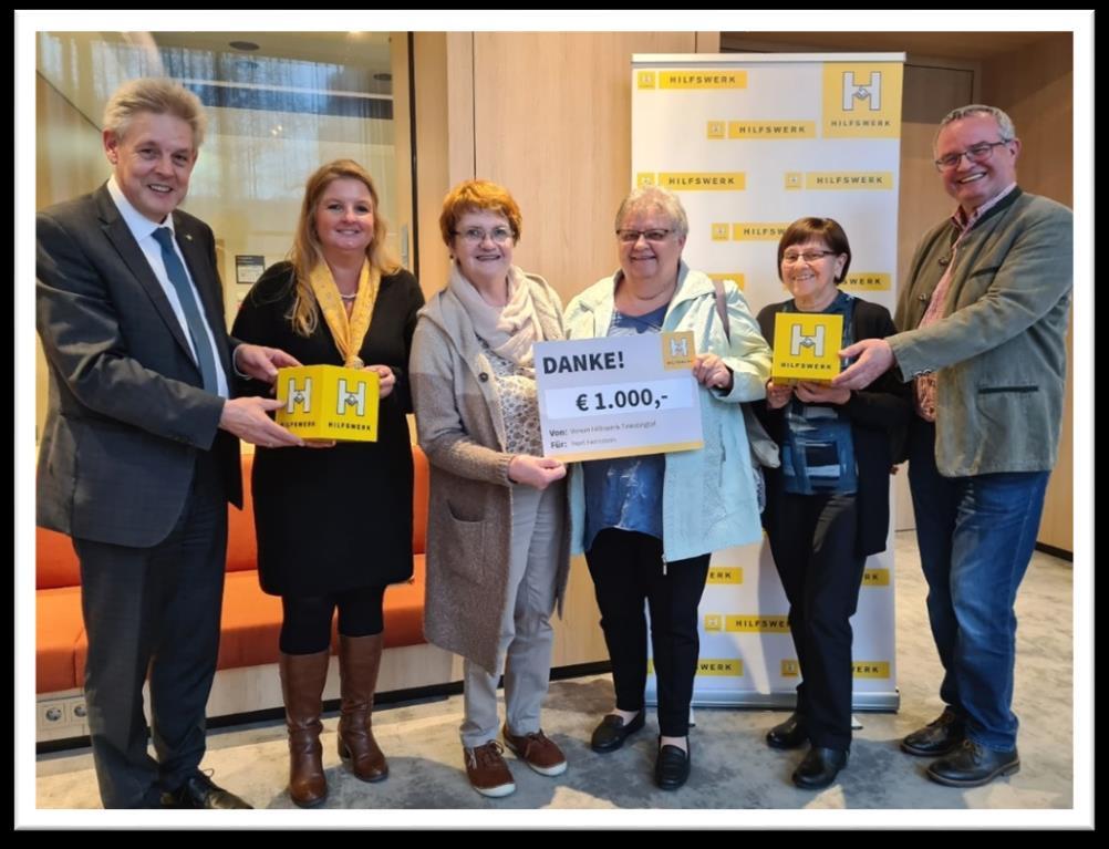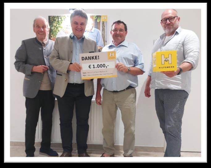DerRotary-ClubGerasWaldviertelspendetjährlicheinenBetragandasHilfswerkRetzerLand-Pulkautalfür KinderinderLernbegleitung. VorstandmitgliedMagisterHaraldOppeckübergibtdemVorsitzendenManfred MarihartinAnwesenheitvonLandesgeschäftsführerdesHilfswerksNiederösterreichMag.ChristophGleirscher undEhrenvorsitzendenReinholdGrieblereinenScheckinderHöhevon€1.000, HerzlichenDank!
