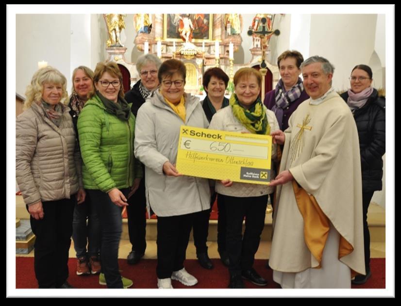 BeimSonntagsgottesdienstam23.AprilüberreichtendieVertreterdesPfarrgemeinderatsSallingberg eine SpendeandenVereinHilfswerkOttenschlag.EshandeltesichdabeiumdenErlös,derbeimFastensuppenessen am12.Märzerzieltwurde.DerBetragsolldemBesuchsdienstdesVereinszugutekommen.HertaZeinzinger,die VorsitzendedesHilfswerksOttenschlagsprachihrenDankanMargareteFichtingerunddieMitgliederdes Pfarrgemeinderatsaus.DieLeiterindesBesuchsdienstes,HertaHacklbetonte,dassmitdieserSpendeerstmals einesichtbareAnerkennungfürdieLeistungendiesesbesonderenAngebotsgezeigtwird.