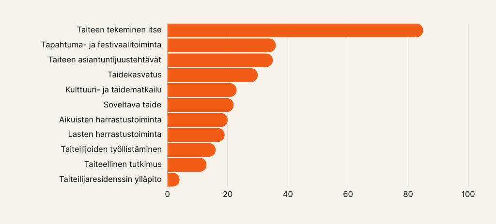 Lapin ja Saamenmaan alueella toimivien taiteen ja kulttuurin ammattilaisten toiminta on hyvin monimuotoista. Vain 23,6% kaikista vastanneista (ml. yhteisöt ja yksittäiset ammattilaiset) kertoi toteuttavansa vain yhtä toimintamuotoa. Yleisin vastaus vain yhden vaihtoehdon valinneista oli “Taiteen tekeminen itse”. Monivalintakysymys oli kirjoitettu muotoon “Millaista taidetoimintaa toteutat?” ja vastaaja pystyi valitsemaan niin monta vastausvaihtoehtoa, kun halusi kuvatakseen omaa tai yhteisönsä taidetoimintaa. 69,7% vastaajista vastasi ainoana tai yhtenä useista vaihtoehdoista “Taiteen tekeminen itse”. Toiseksi yleisin vastaus joko ainoana tai yhtenä useista vaihtoehdoista oli “Tapahtuma- ja festivaalitoiminta”, jonka valitsi 47,1% vastaajista. Kolmanneksi yleisimmäksi vastaukseksi nousi “Taiteen asiantuntijuustehtävät”, jonka valitsi 35,5% vastaajista