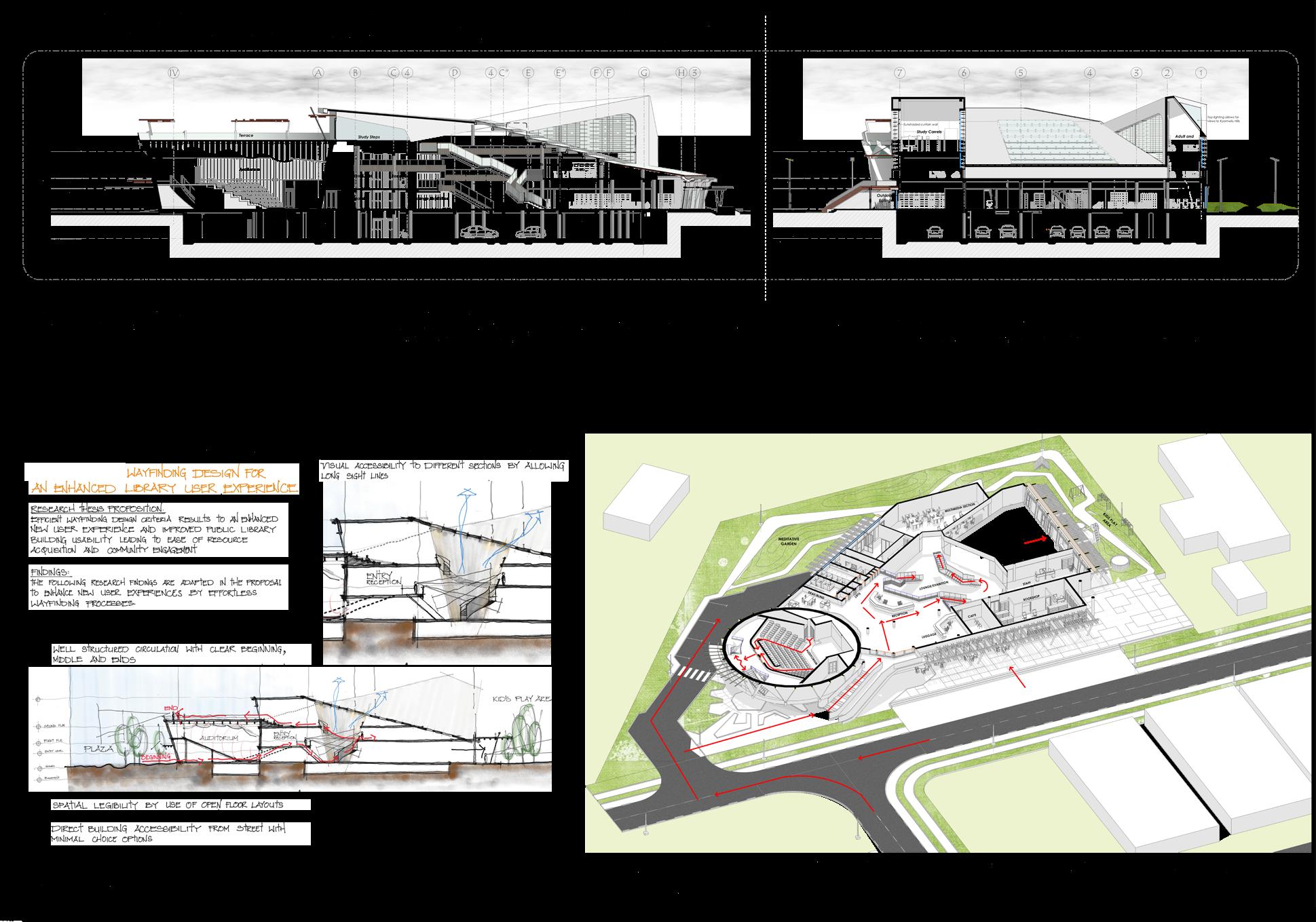 The emphasis of the project is on the relationship between architectural context [Cultural, Environmental, Physical], the public, and the information provided by libraries –both digital and physical media, all put together in an efficient wayfinding design environment for an enhanced public library user experience.
