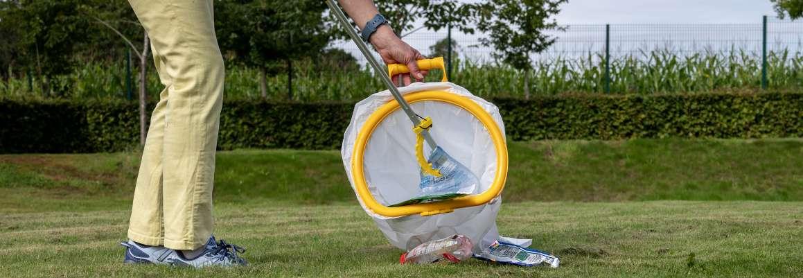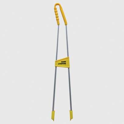 Trash picker, with light but strong aluminum body, sturdy high visibility yellow plastic parts, sprung steel return with angled grip.