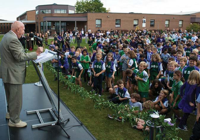 ON A WARM EARLY SEPTEMBER DAY IN 2001, HSC Headmaster Bill Boyer had just finished leading the outdoor celebration of the College’s 100th anniversary. Now he was strolling across the campus with his honoured guest, Michael G. DeGroote, one of Hamilton’s—and Canada’s—most generous philanthropists and HSC’s largest donor. In 2003, the former transport titan would famously give McMaster University $105 million for a School of Medicine, following up on his DeGroote School of Business. And the HSC Patron had already supported the College with a $500,000 gift for the Michael G. DeGroote Gymnasium and many smaller donations.