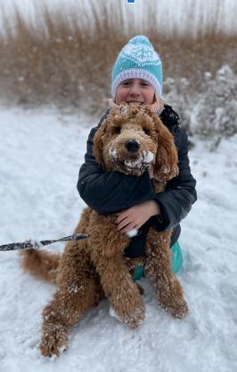 This is Rocket Whaling with his "sister" Charlotte. Rocket is a two-year-old golden doodle who loves to play and cuddle.