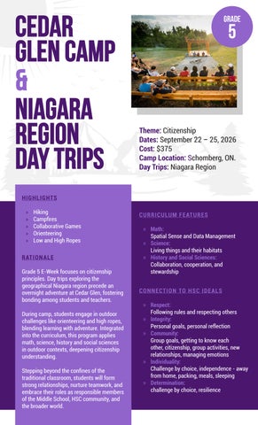 Grade 5 E-Week focuses on citizenship principles. Day trips exploring the geographical Niagara region precede an overnight adventure at Cedar Glen, fostering bonding among students and teachers.