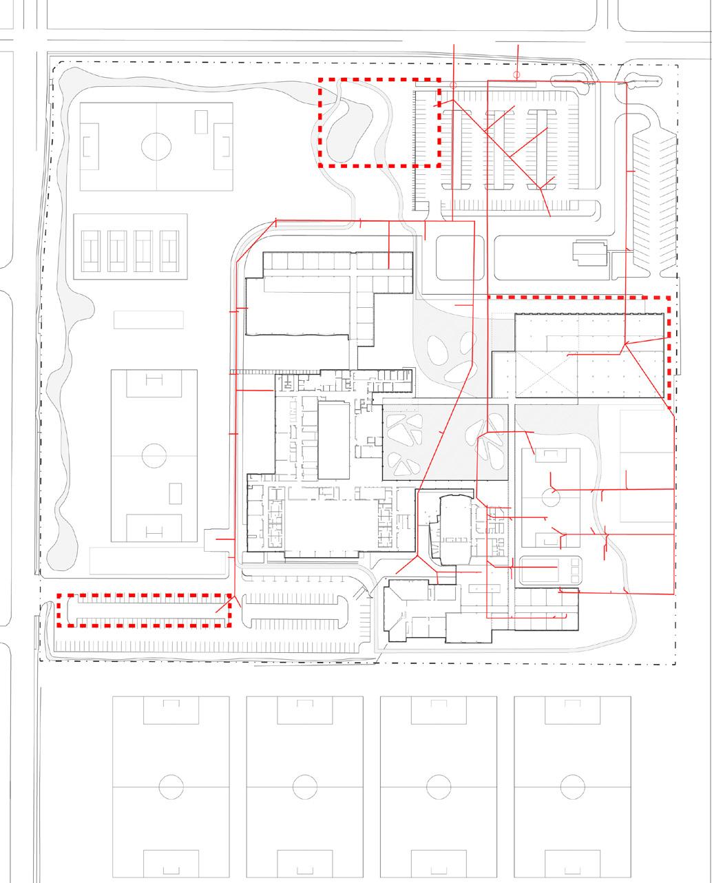 The proposed Middle School should be able to be serviced via existing service mains that run adjacent to the proposed building site but an existing electrical duct would need to be relocated to allow for the construction of this building. The new Dining Hall and Innovation Hub conflicts with a number of existing site services. The currently proposed phasing would require these services to continue to be in use while the proposed Dining Hall and Innovation Hub are being constructed. Therefore, the existing services will need to be relocated to run outside of the footprint of the proposed new building before construction can begin on the building itself.