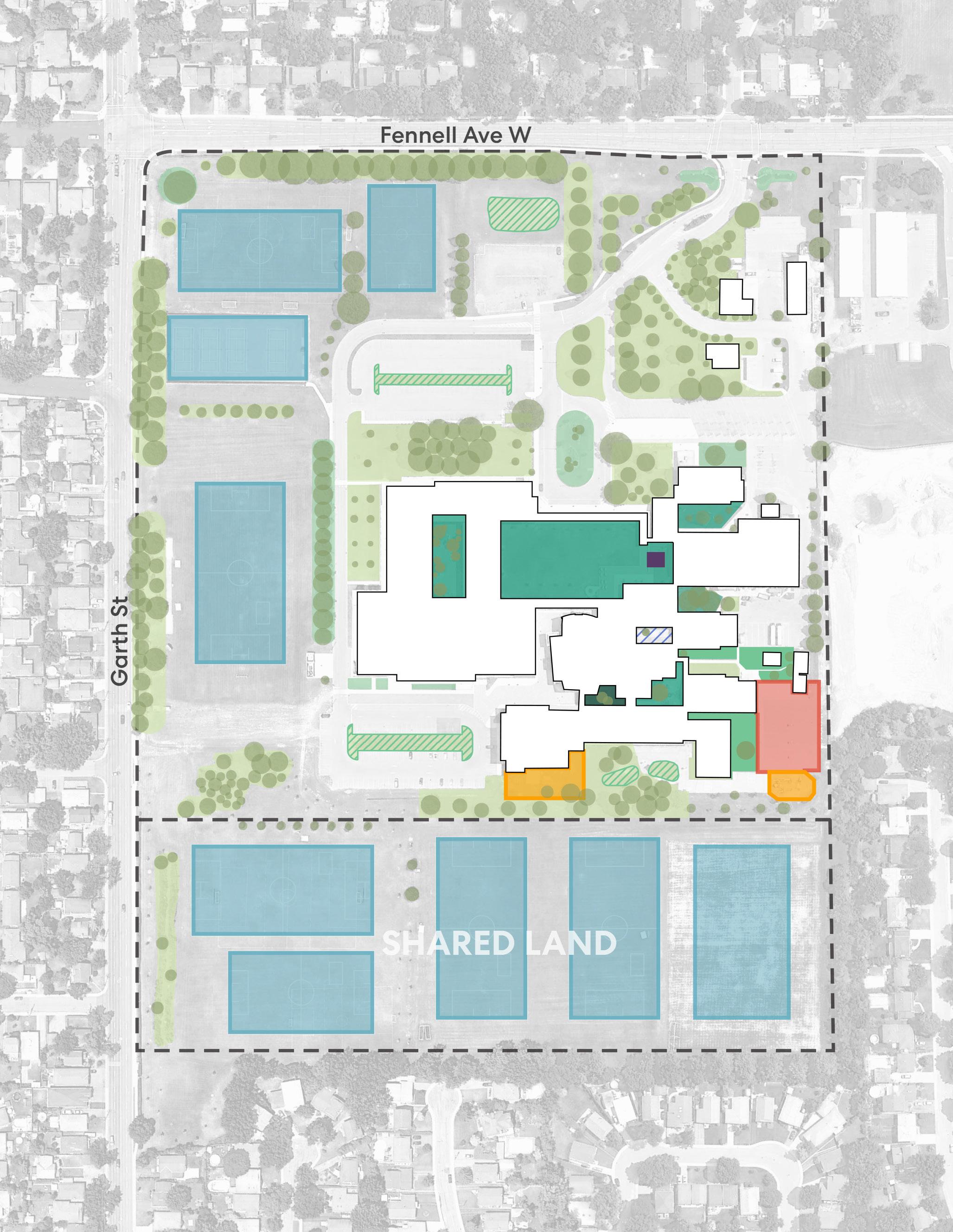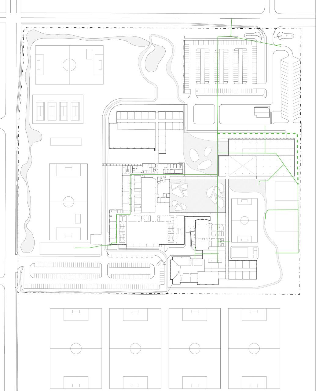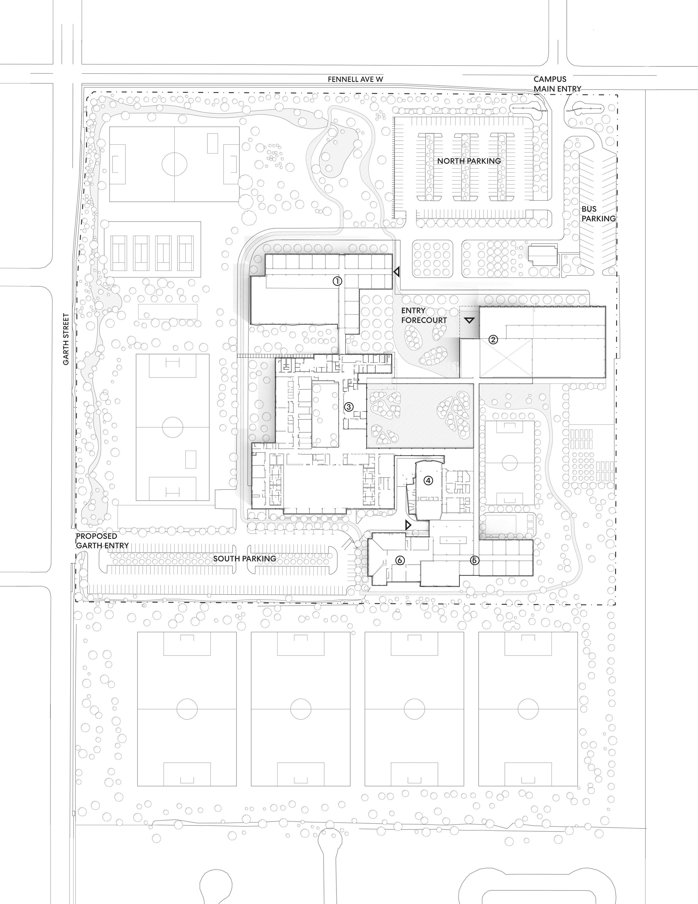 anchored with communal spaces, with flexible teaching spaces inserted to allow maximum connection between indoor and outdoor learning. A new campus entrance is added from Garth Street, taking pressure off a reconfigured entry sequence from Fennell Avenue West.