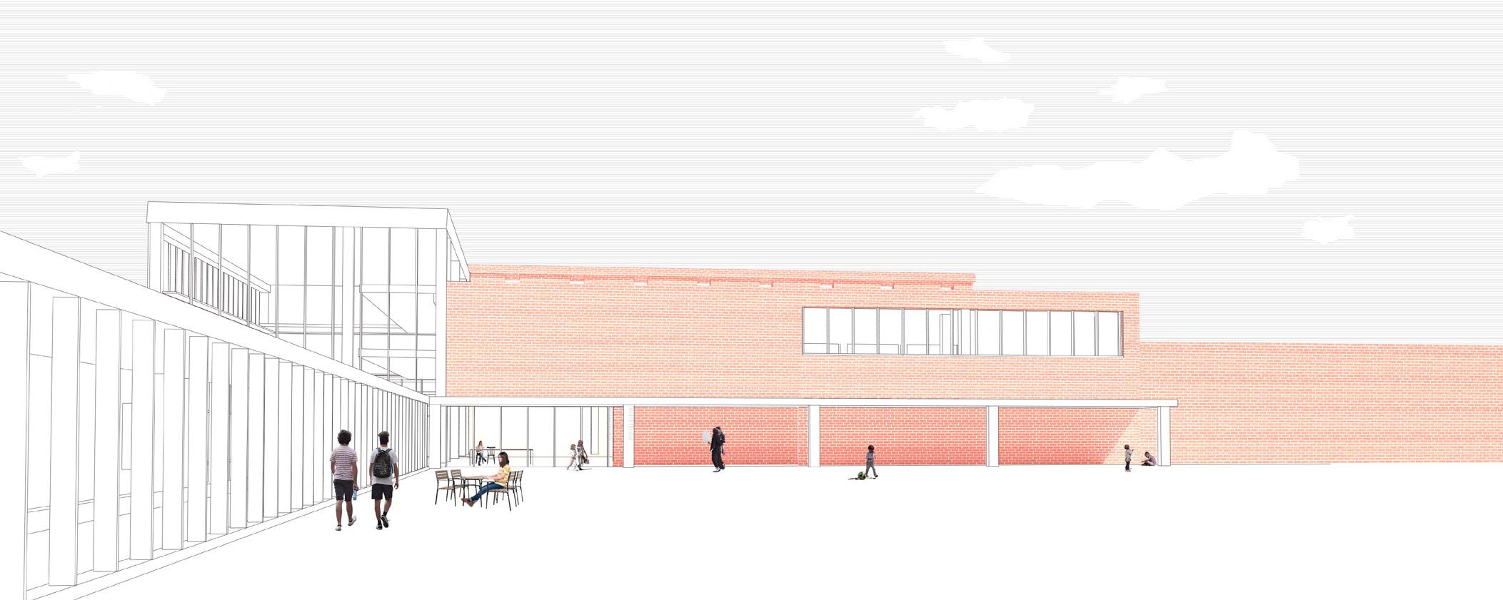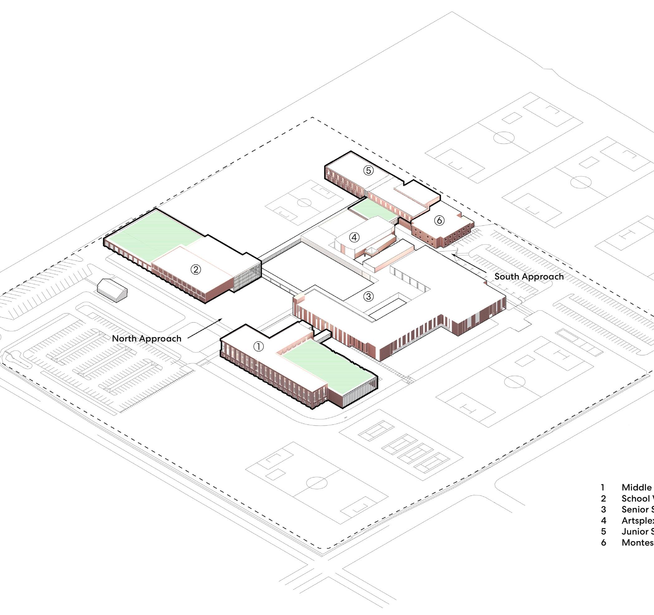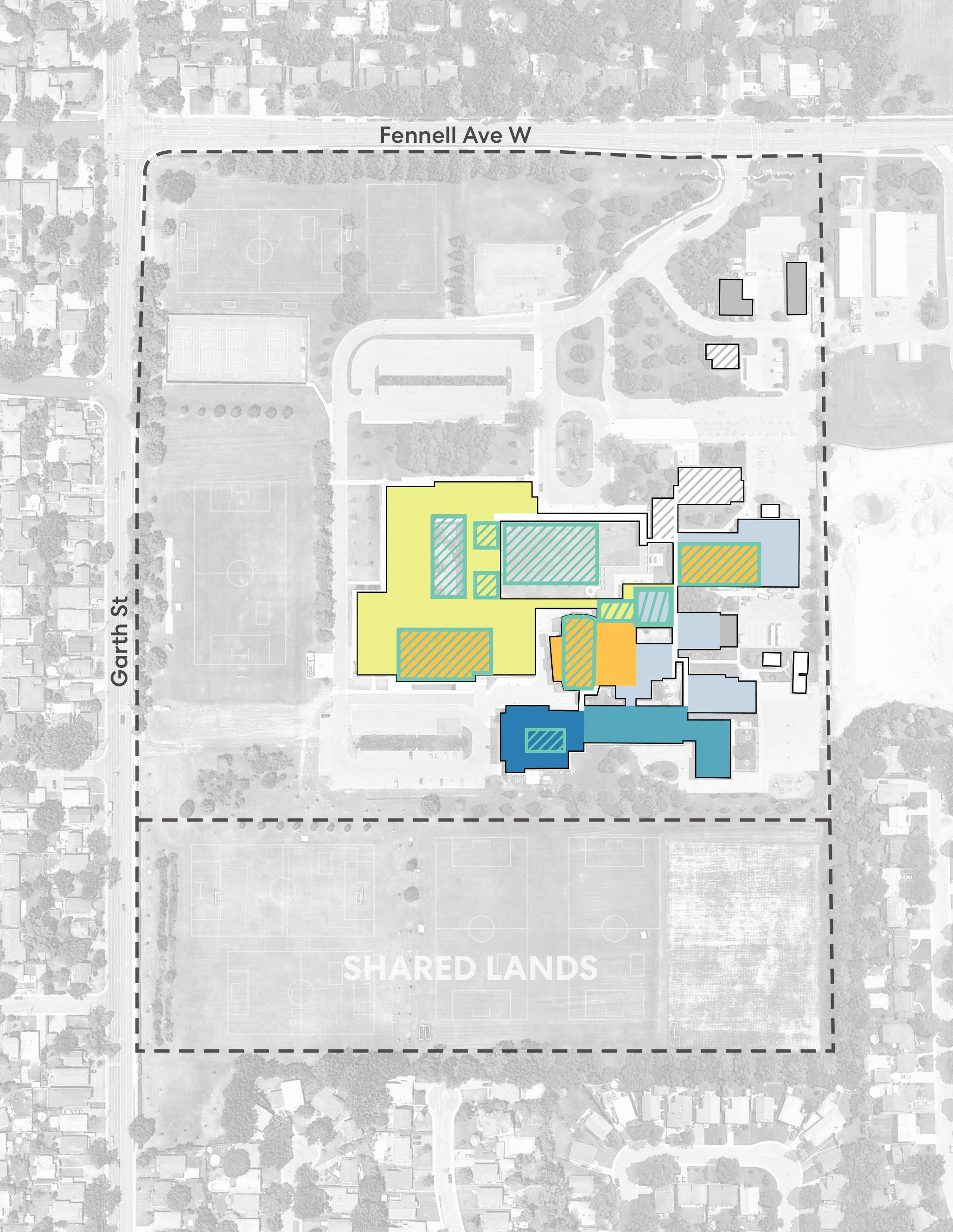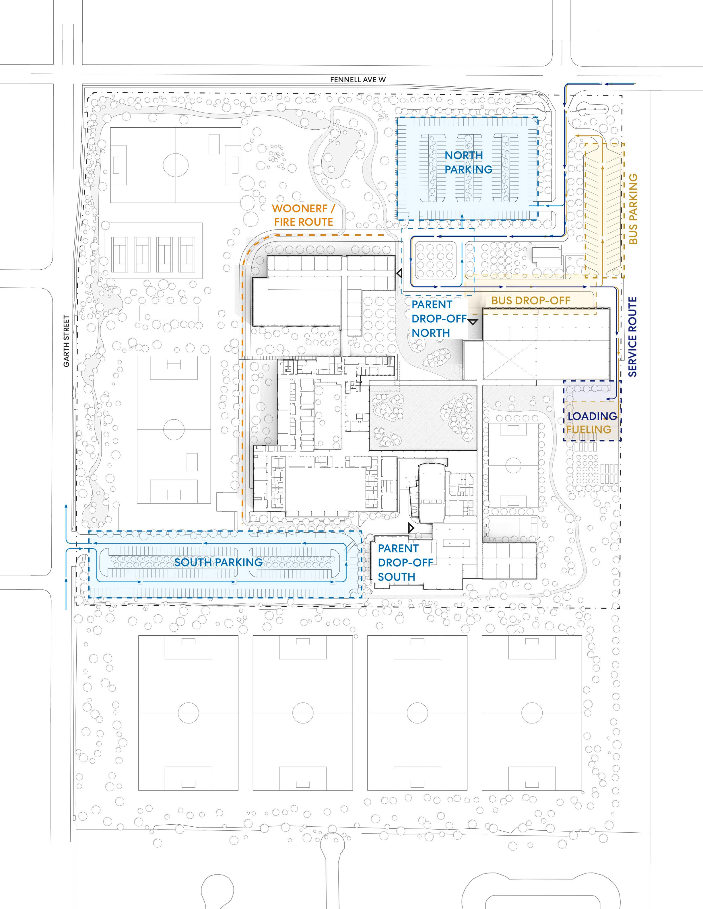 anchored with communal spaces, with flexible teaching spaces inserted to allow maximum connection between indoor and outdoor learning. A new campus entrance is added from Garth Street, taking pressure off a reconfigured entry sequence from Fennell Avenue West.