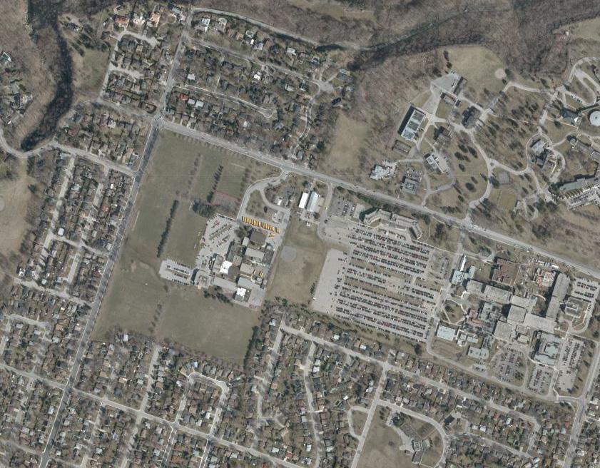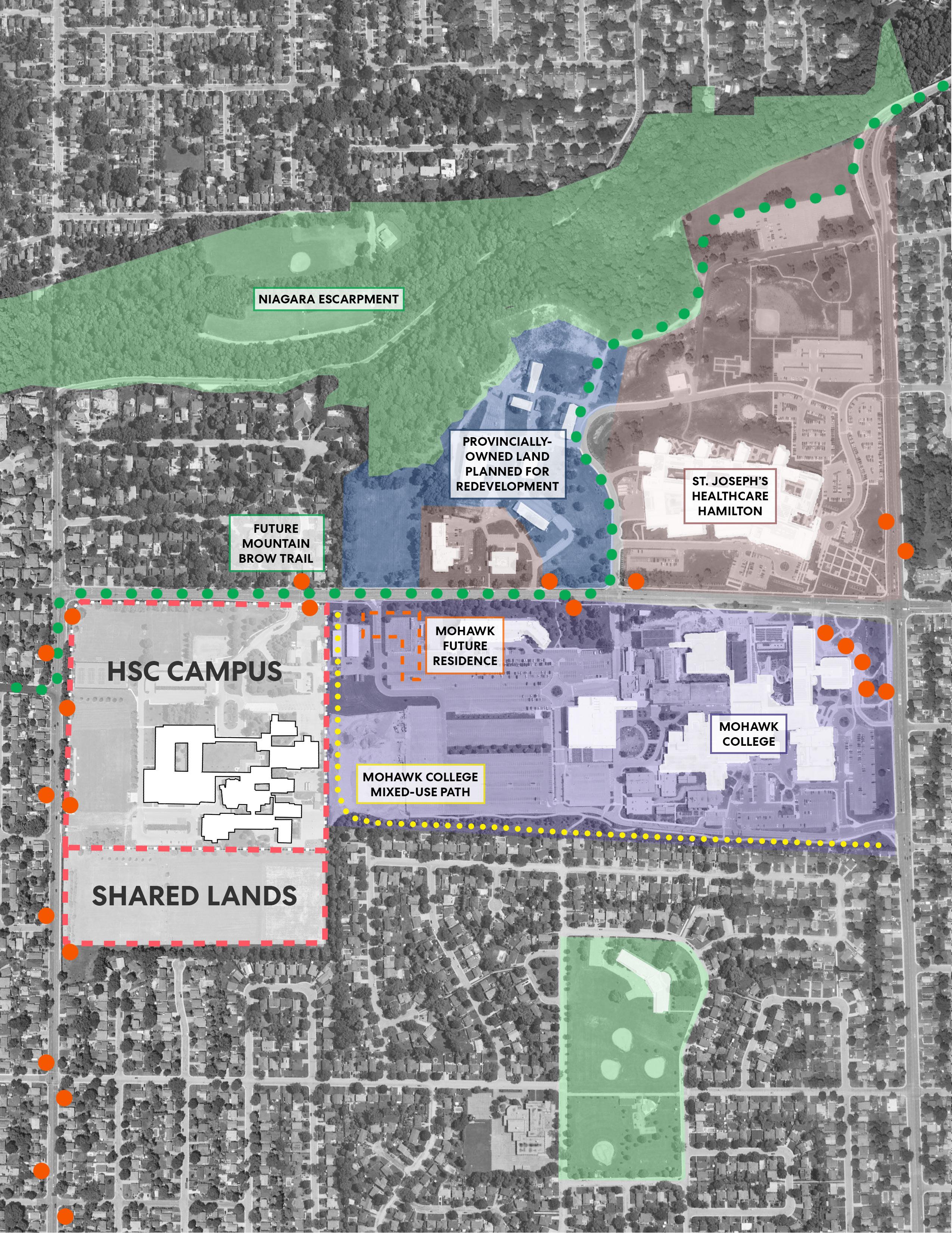 As noted in the College’s land acknowledgement, HSC is situated on Haudenosaunee and Anishinaabe territory, as recognized and documented by the Upper Canada Treaty Agreements, adjacent to the Haldimand Treaty Territory. Within Hamilton, it sits atop the escarpment in the West Mountain area, necessitating a scenic drive up the escarpment to approach the College from most directions. Seen by many in the school community as an oasis within the city, the campus sits at the nexus between established residential communities to its north, west and south and the growing institutional node including Mohawk College and St. Joseph’s Healthcare Centre to its east and north-east. It is well connected to the rest of the city via municipal bus routes on Garth Street and Fennell Avenue West and major upgrades are planned to activate transportation infrastructure in the area. A new Mixed-Use Path will extend along the campus boundary on Fennell Avenue West and part of Garth Street, eventually connecting to the larger Mountain Brow Trail.