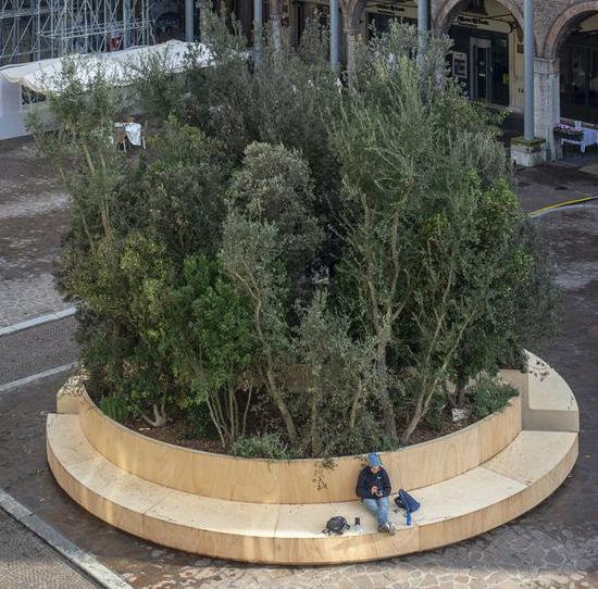 Glazed volume defines intersection of walkways and creates waiting space outside dining