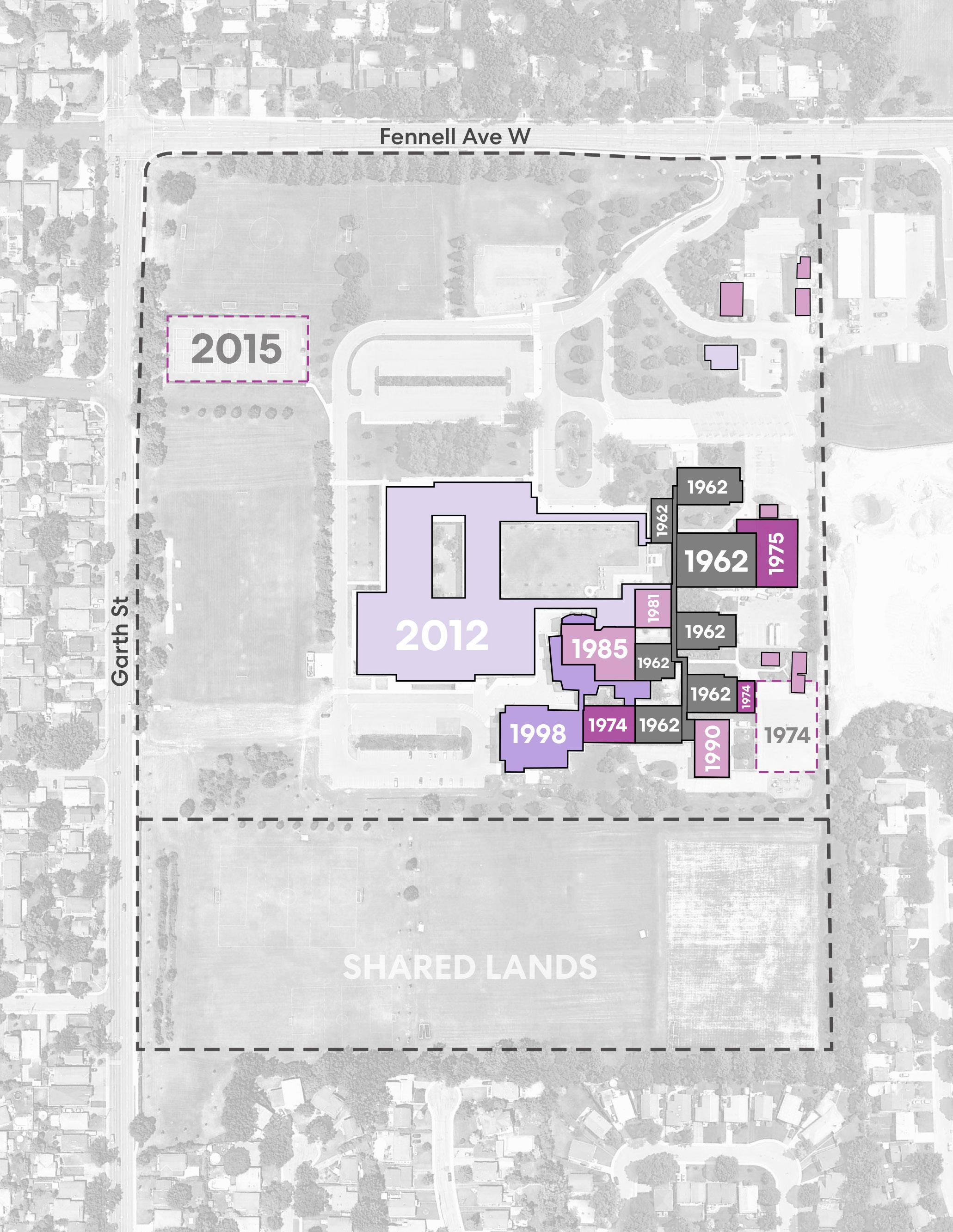 As “one college, four schools,” HSC offers a unique learning experience where students can spend their entire educational career from starting preschool at 18 months to graduating high school at 18 years. The Junior School, Montessori School, Middle School and Senior School each offer a distinct experience within HSC and many students move through two or more of the schools during their time at the College. Important to campus cohesiveness are the things which tie the four schools of the College together. These things can be experiential, like the HSC busing program, where students of all ages ride to campus together before dispersing to their own school, forming bonds with each other and their driver as they do so. College cohesiveness also comes from the spaces and connections of the campus itself—the communal spaces like the DeGroote Athletic Complex where the entire College can meet for assemblies, or the shared outdoor space of the Central College Quad. The schools have also historically been tied together through the connective “spines” of the circulation system, which link each school physically and in school mythology, as alumni are brought together by memories of walking down the non-heated hallways in winter long after graduating.