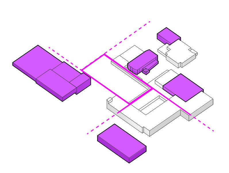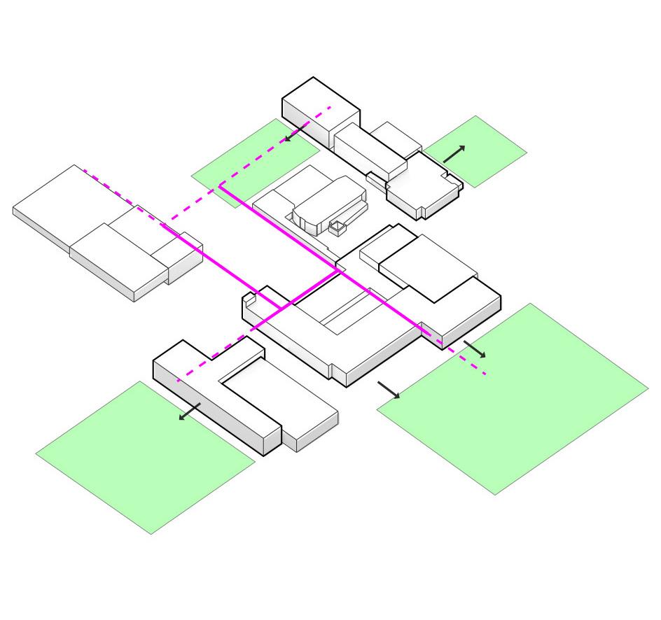 The campus master plan embraces the existing circulation network of exterior breezeways that join interior corridors as a structuring feature, extending the network to connect new buildings and create a circulation “pinwheel.” Programmatic elements are strategically located so that all arms of the pinwheel are