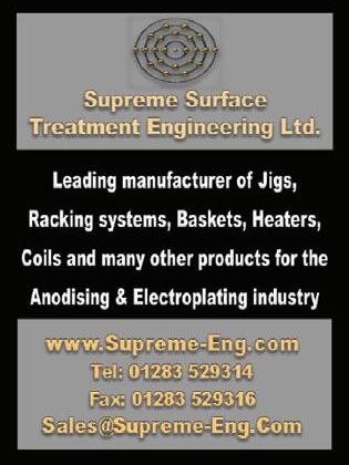 01952 299008 E-mail: sales@pometon.co.uk Eastfield Road, South Killingholme, N.E. Lincolnshire, UK Tel: +44(0)1469 574715 Fax: +44(0)1469 571644 e-mail: sales@scangrit.co.uk www.scangrit.co.uk Scangrit has become one of the leading suppliers of blasting abrasives by meeting the rigorous demands of European Industries. We combine huge resources of skill and expertise to provide you with the widest range of top-performing products, a first-class technical support service and fast reliable deliveries. When you need to take abrasive action, you’ll find Scangrit is a hard act to follow. ABRASIVE BLASTING EQUIPMENT Straaltechniek UK Ltd Unit 8 Valley Works, Grange Lane, Sheffield, S5 0DQ Tel: 01142 571077 Fax: 01142 571075 www straaltechniek co uk For all your Shotblasting & Engineering needs. ADVICE BOILERS & STEAM GENERATORS • 100Kg/h – 25,000Kg/h • High efficiency – up to 96% • Low overall emissions • Improved safety • Simplicity of control • Quiet, clean & cool in operation Modern Coil Type Steam Generators & Fire Tube Boilers Tel: 020 8953 7111 info@babcock-wanson.com www.babcock-wanson.com ACID PROOF EQUIPMENT telephone: 0044(0)1509 237415 fax: 0044(0)1509 264455 COMPLETE FINISHING PLANT • PLANT CONTROL SYSTEMS • DATA MANAGEMENT SYSTEMS • BARRELS - PROGALVANO ROTOR • BARREL AUTO LOADING SYSTEMS • PROGALVANO FILTERS • SEMI/AUTOMATIC FILTER SYSTEMS • CENTRIFUGAL DRYERS La ge Range) • AUTOMATIC DRYING SYSTEMS • ROTARY PAINTING/LAQUERING • TOP COATING/SEALING SYSTEMS • VIBRATORY POLISHING EQUIPMENT • LUBRICATION EQUIPMENT • RECTIFIERS Conventional & Pulse • A/HOUR METERS & DOSING PUMPS THE LOWER THE TEMPERATURE THE HIGHER THE THE IMPACT