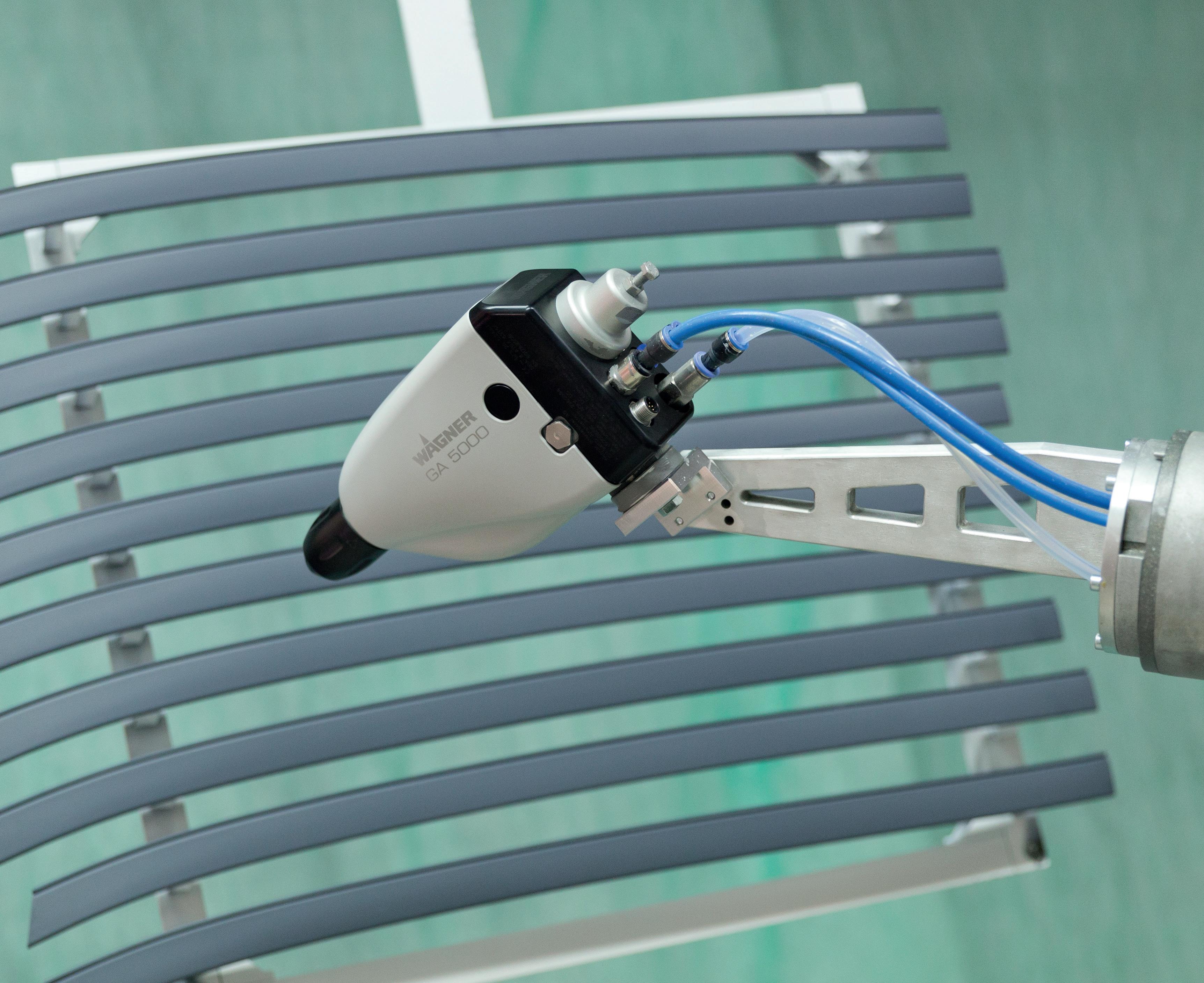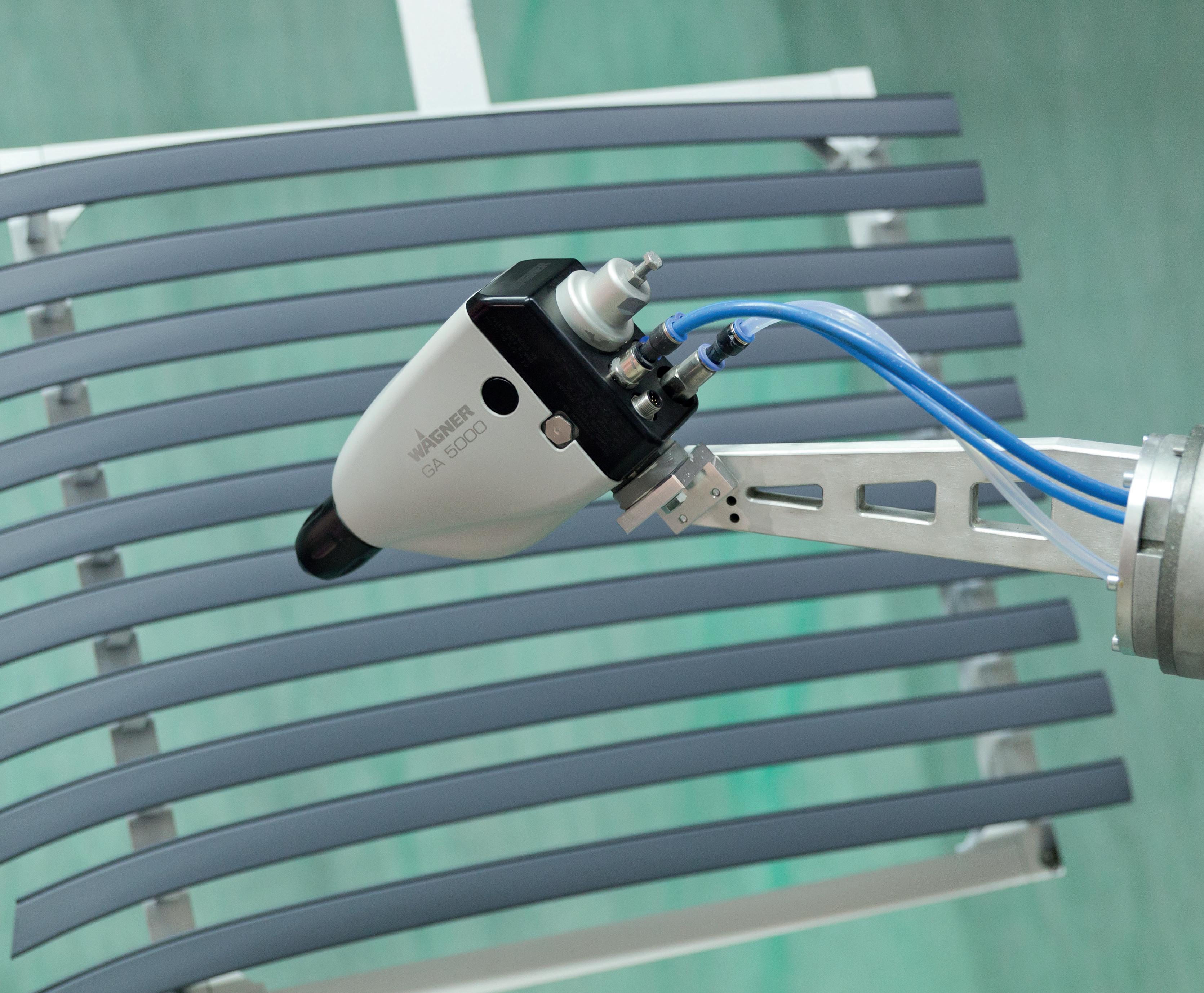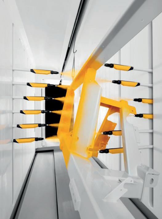 it was clear that these new to market technologies would move our capabilities to a new level. The benefits of the dynamic contouring application guns that track the product geometries in real time are clear (pictured left). This revolutionises the level of automation and, combined with the SIT dense phase pumps, the powder coverage and consistency of application is on a new level. The booth is extremely quiet and offers a clean working environment with reduced carbon footprint thanks to its compressed air and energy optimisation systems.”