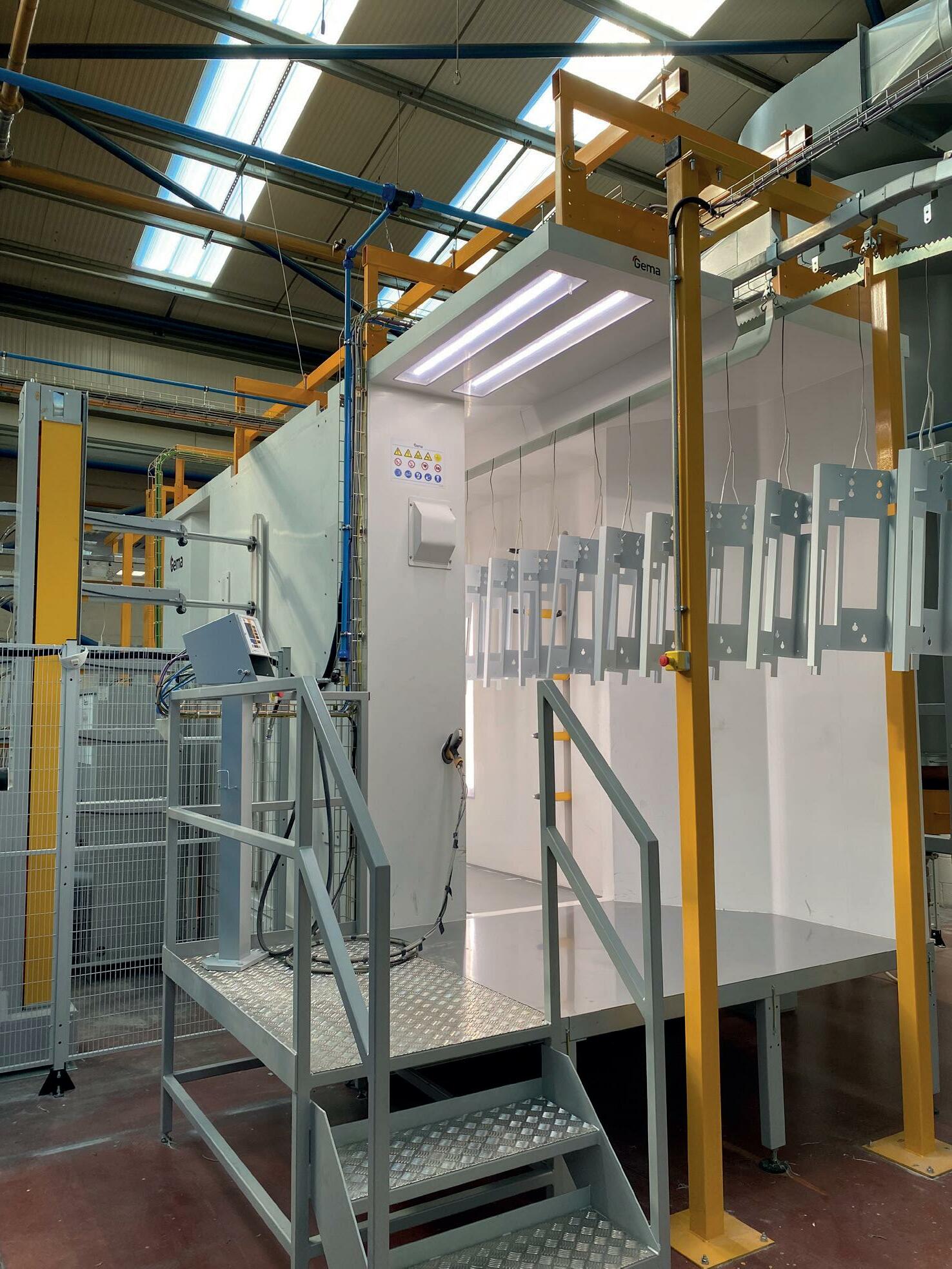 A bespoke-designed batch line allows Hydram to optimise the low volume, highly variable parts with great flexibility in a compact footprint. The second line is a large, highly automated conveyorized line installed over a 6-week period. The plant has a 145m overhead conveyor capable of processing a full range of components, from flat parts to complex geometries, with high throughput capability. Pre-treatment is handled by a 20m-long five-stage plant with eco-friendly nano-ceramic multi-metal pre-treatment solution, coupled with a 15m-long dry-off oven. The automated process is supported by a fast colour change booth, provided by market leader Gema Europe (pictured above). The booth selected is the MagicCompact system with 2nd generation dynamic contouring guns, high efficiency powder reclamation and the recently launched GemaConnect cloudbased monitoring system. A 38m-long curing oven completes the plant and it is fitted with heat-recovery equipment.